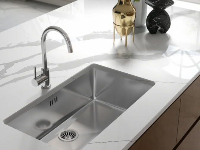 臺面通常使用12 mm、15 mm厚度的巖板。巖板臺面加工要求精度高,一般用紅外線水鋸開料,水刀編程開孔,全制動大型水磨光拋光機來拋光,巖板專用膠水粘接擋水和接縫。
