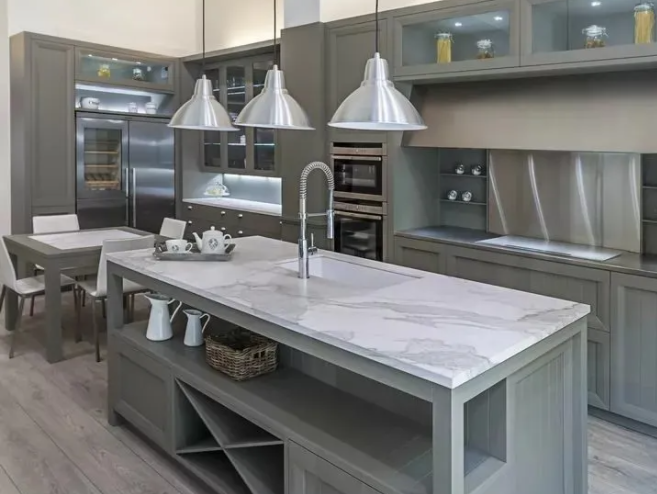 巖板可以應用在櫥柜、餐桌等家居產品的臺面。巖板由于規格幅面大,可以提供一整塊櫥柜臺面,與清洗空間和烹飪空間融為一體,減少留縫,不易留下臟污,方便清理。